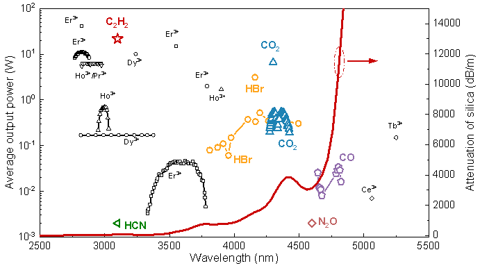 这类激光器利用空芯光纤中气体分子振转能级的本征吸收跃迁产生激光,在实现中红外激光波段输出有着得天独厚的优势,具有阈值低、线宽窄等特点。目前利用空芯光纤填充乙炔、二氧化碳、溴化氢、一氧化碳等气体,已经实现了3μm至5 μm多个波段的激光输出,代表性进展如图1所示。乙炔填充的空芯光纤气体激光器研究最为深入,实现3.1μm 21.8 W连续波激光输出,创下该类型激光器功率纪录。以溴化氢为介质的激光器则展现出卓越的宽波段输出能力,输出波段覆盖3810-4496 nm,单波长线宽小于 100 MHz,最高功率已突破10W。目前,此类激光器在一氧化碳填充下输出波长已突破4.8 μm,进一步拓展了石英基光纤激光器输出的最长波长。