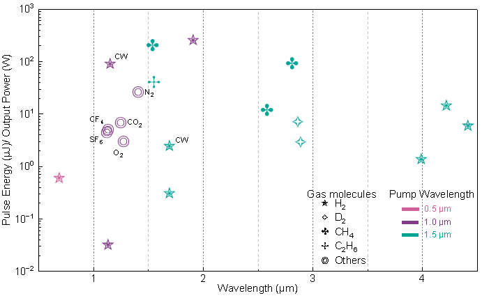 图2:基于受激拉曼散射的空芯光纤气体激光进展。