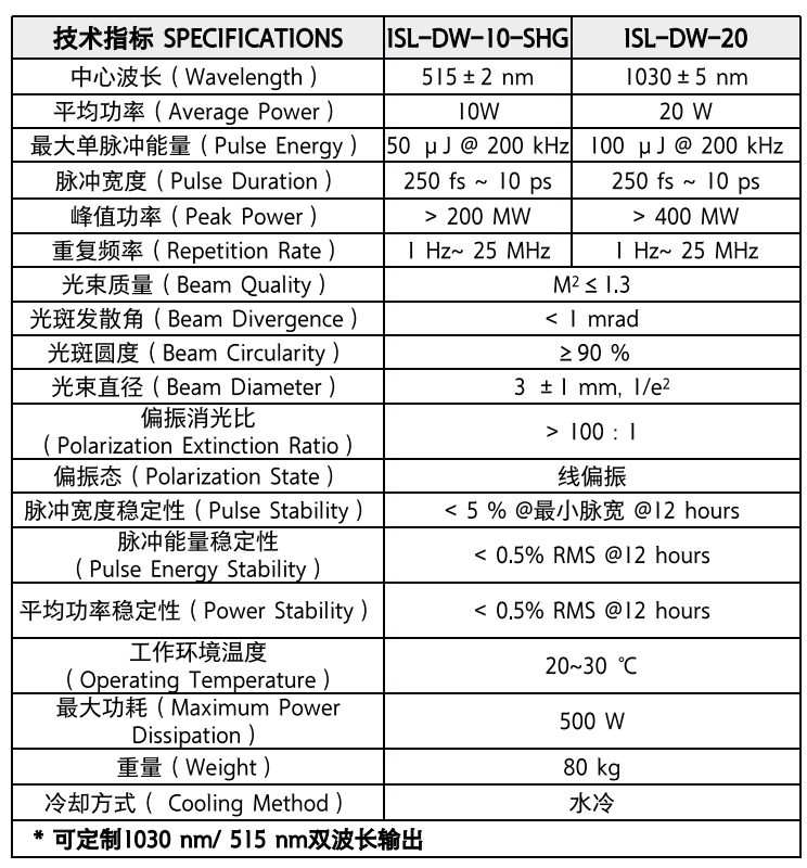ISL-DW 系列双波长飞秒激光器是由爱鸥光学自主研发生产的,具备极高稳定性和可靠性的光纤飞秒激光器产品。本产品采用独创的智能主动稳定系统,通过对飞秒脉冲的全域智能识别以及飞秒激光器参数的全局优化控制,提供无与伦比的稳定性和抗干扰能力。整机采用一体化设计,集成1030nm 和515nm 两种输出波长可选,脉冲宽度小于250 fs,单脉冲能量最高可达100μJ,并且具有丰富的脉冲选择和输出控制功能。